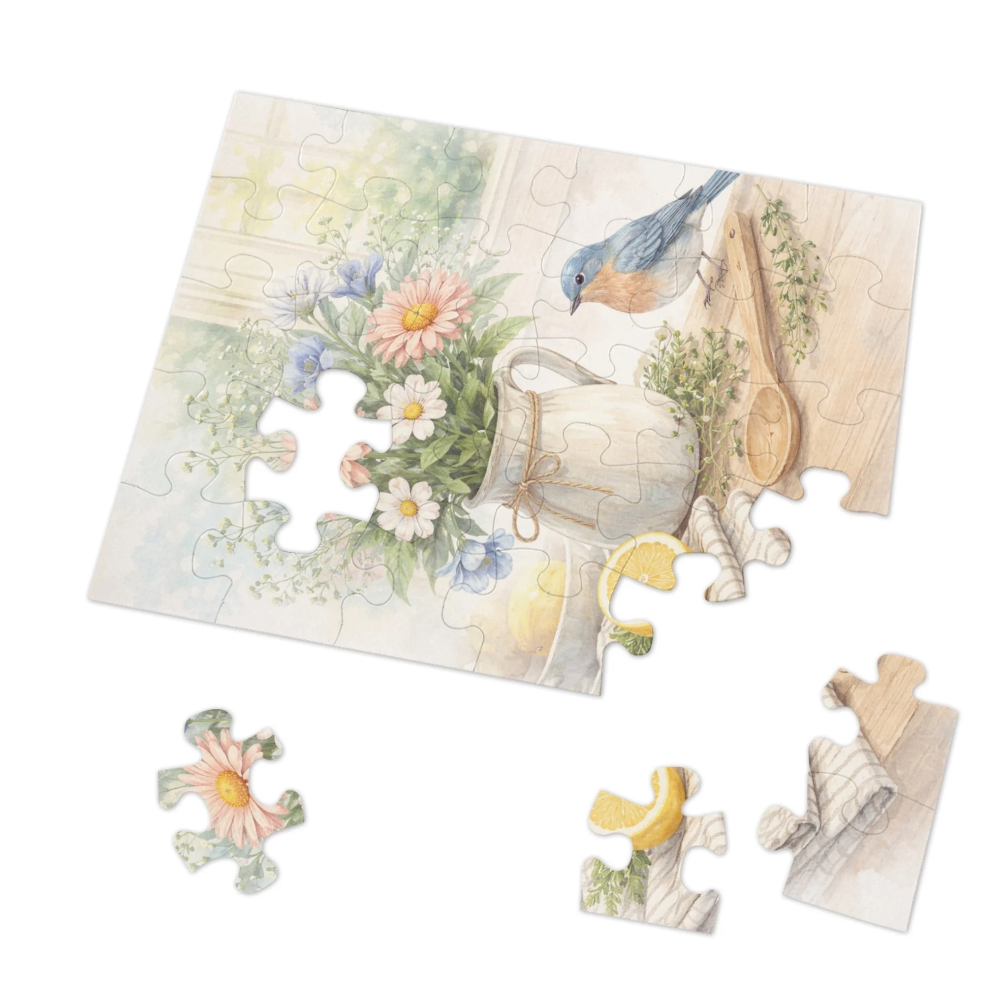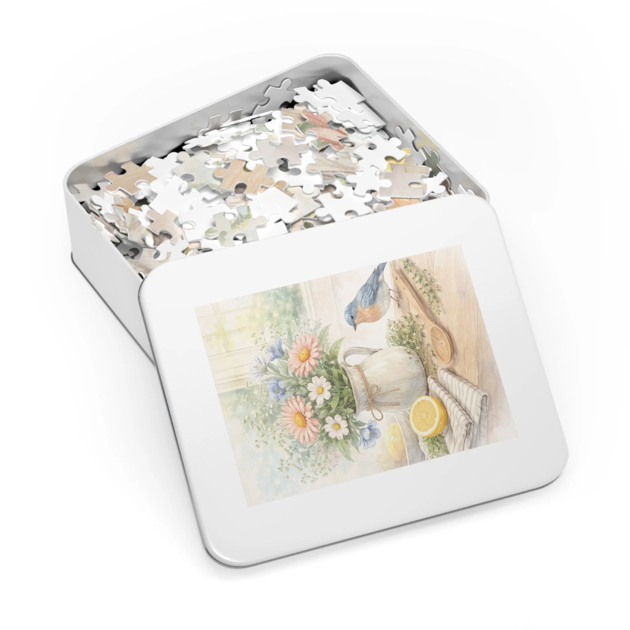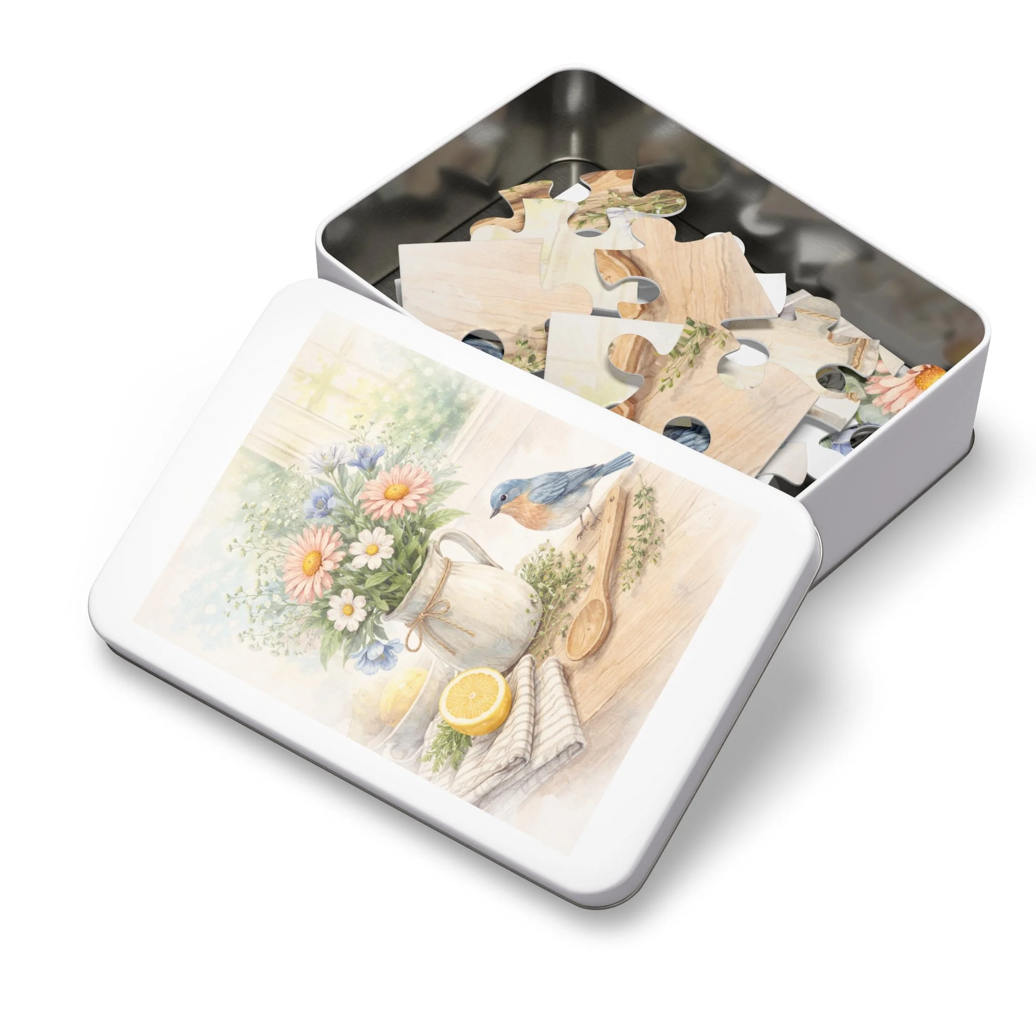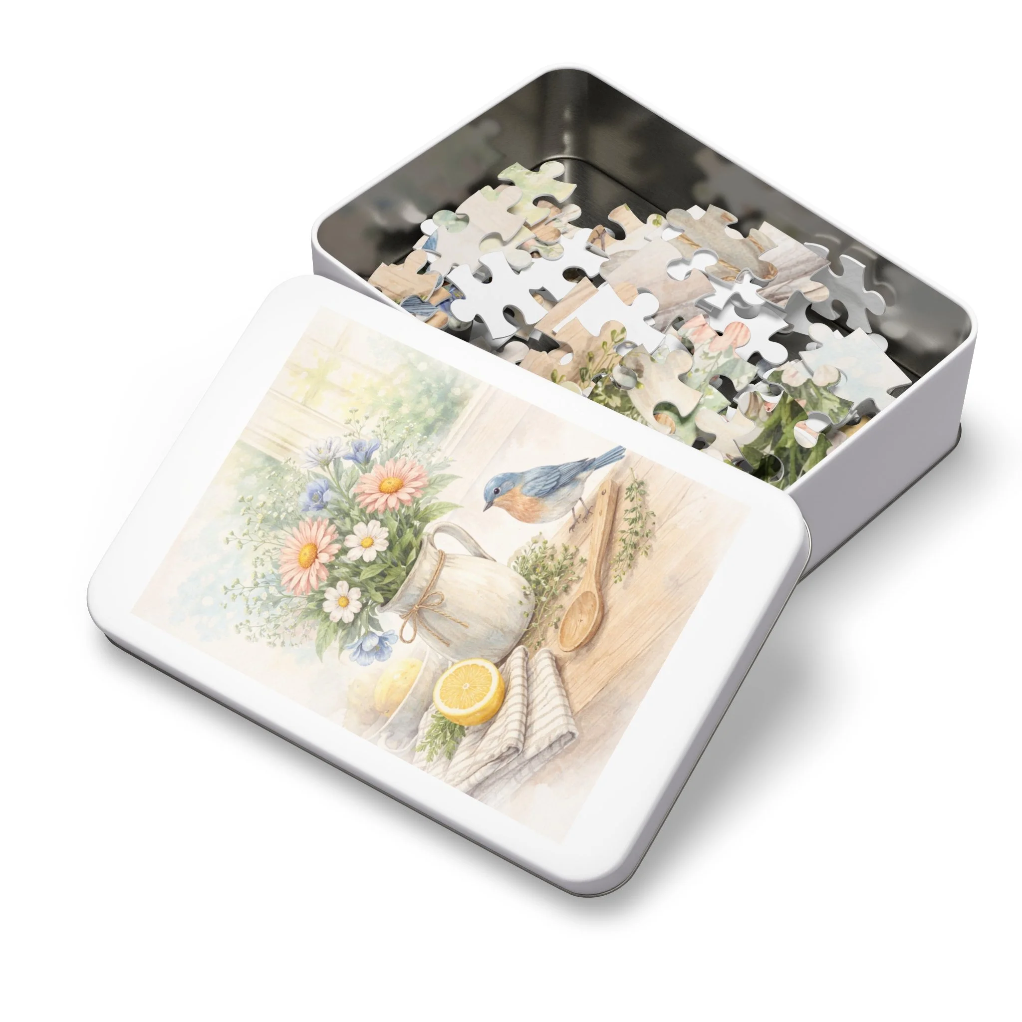 Floral Bluebird Jigsaw Puzzle with Tin — Cottage Kitchen Watercolor Scene