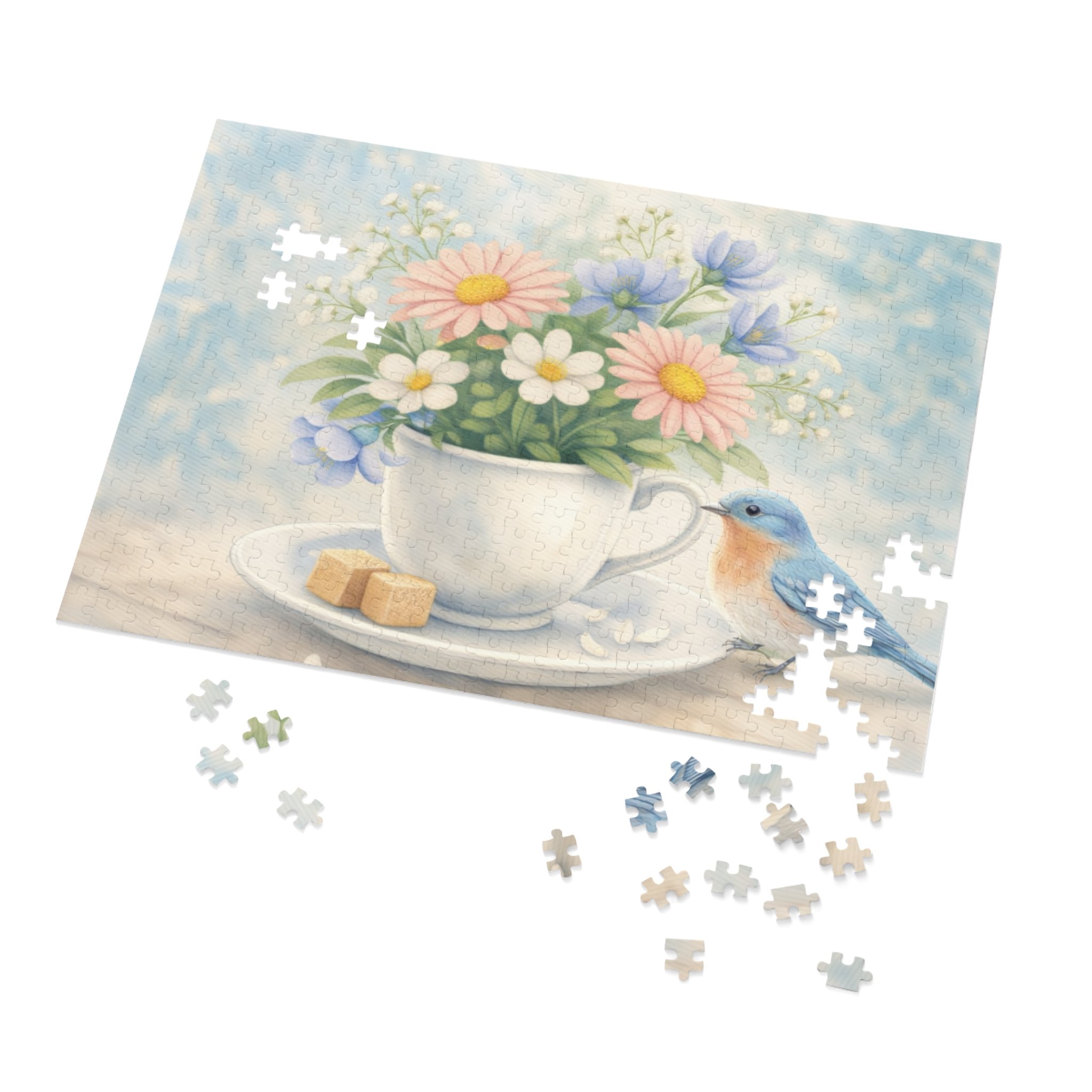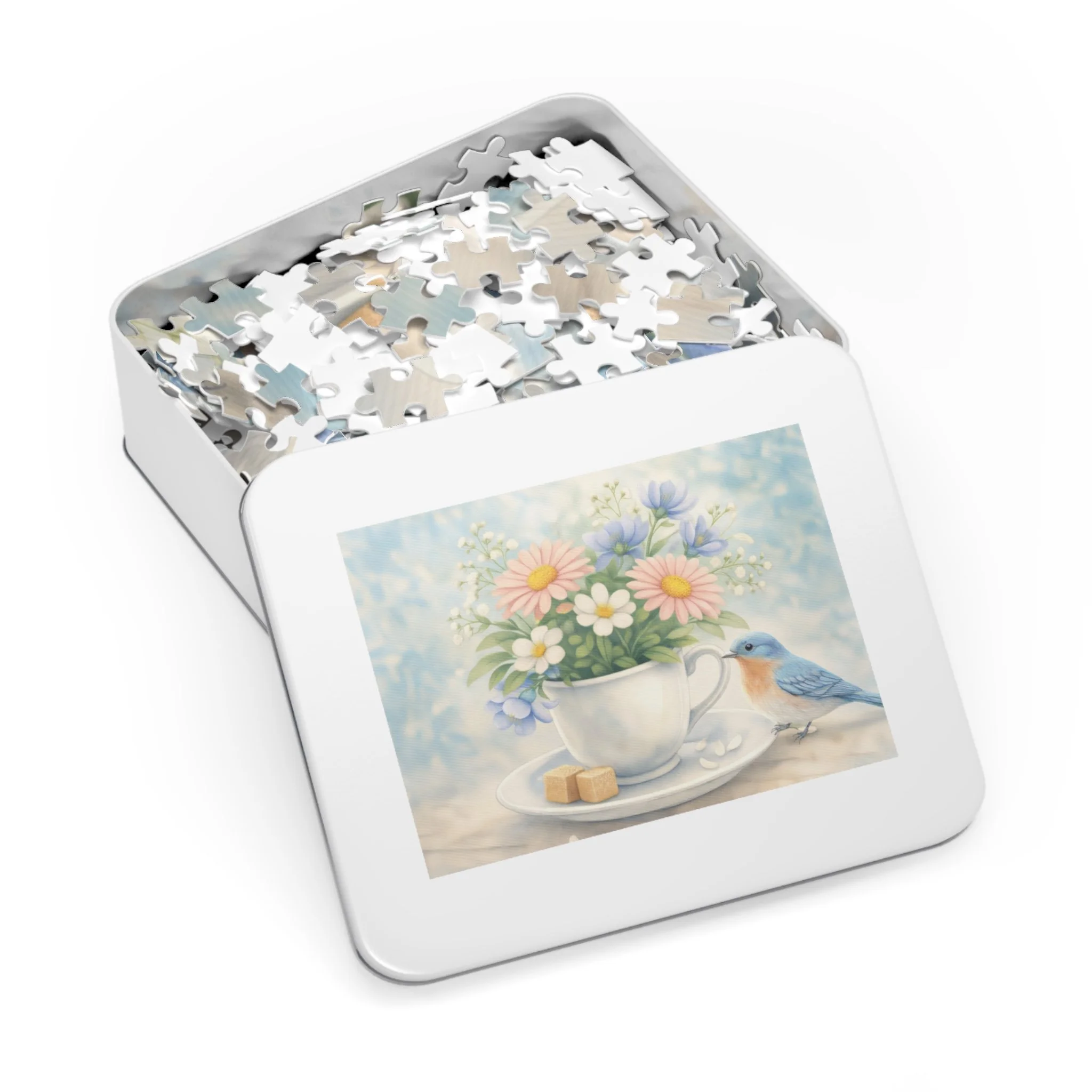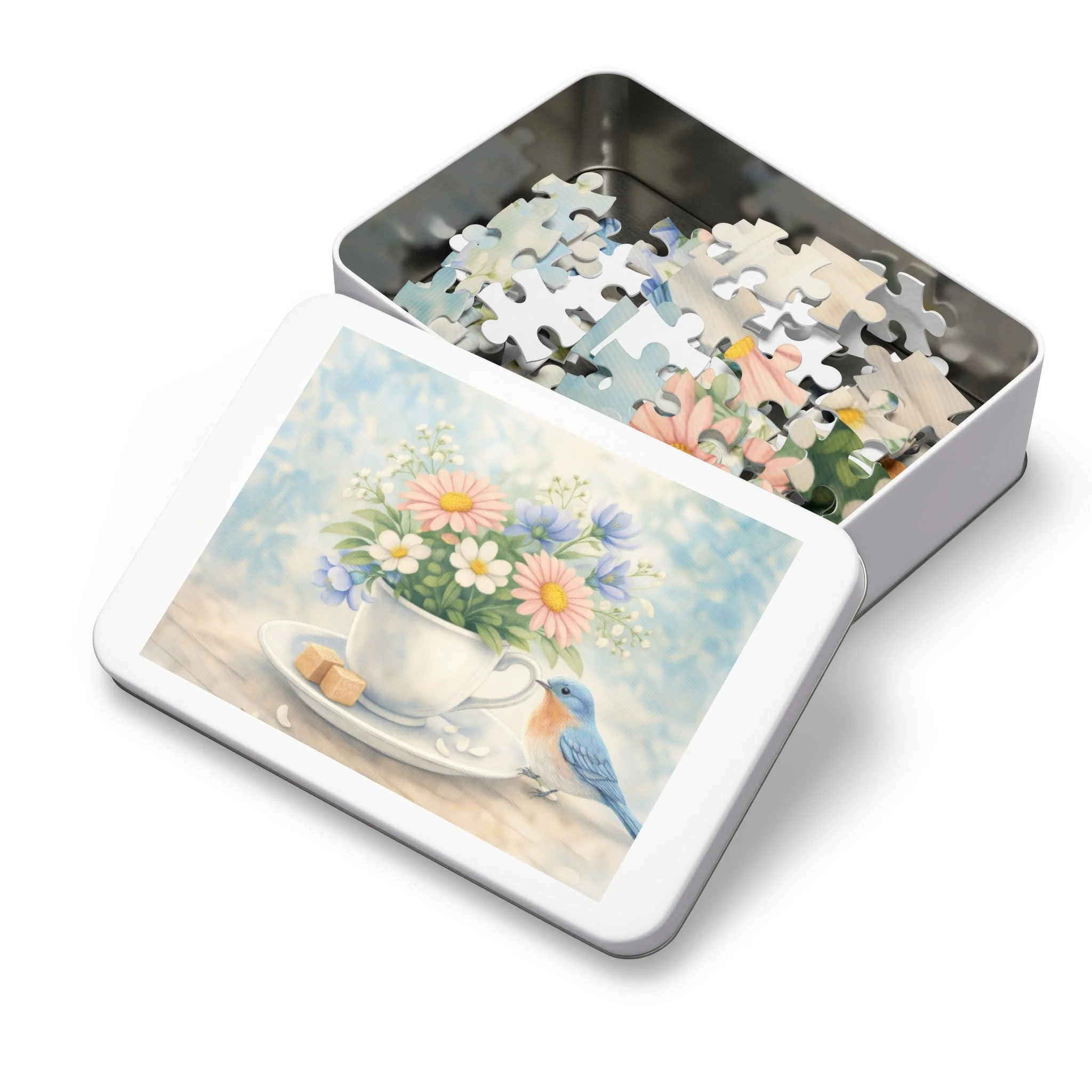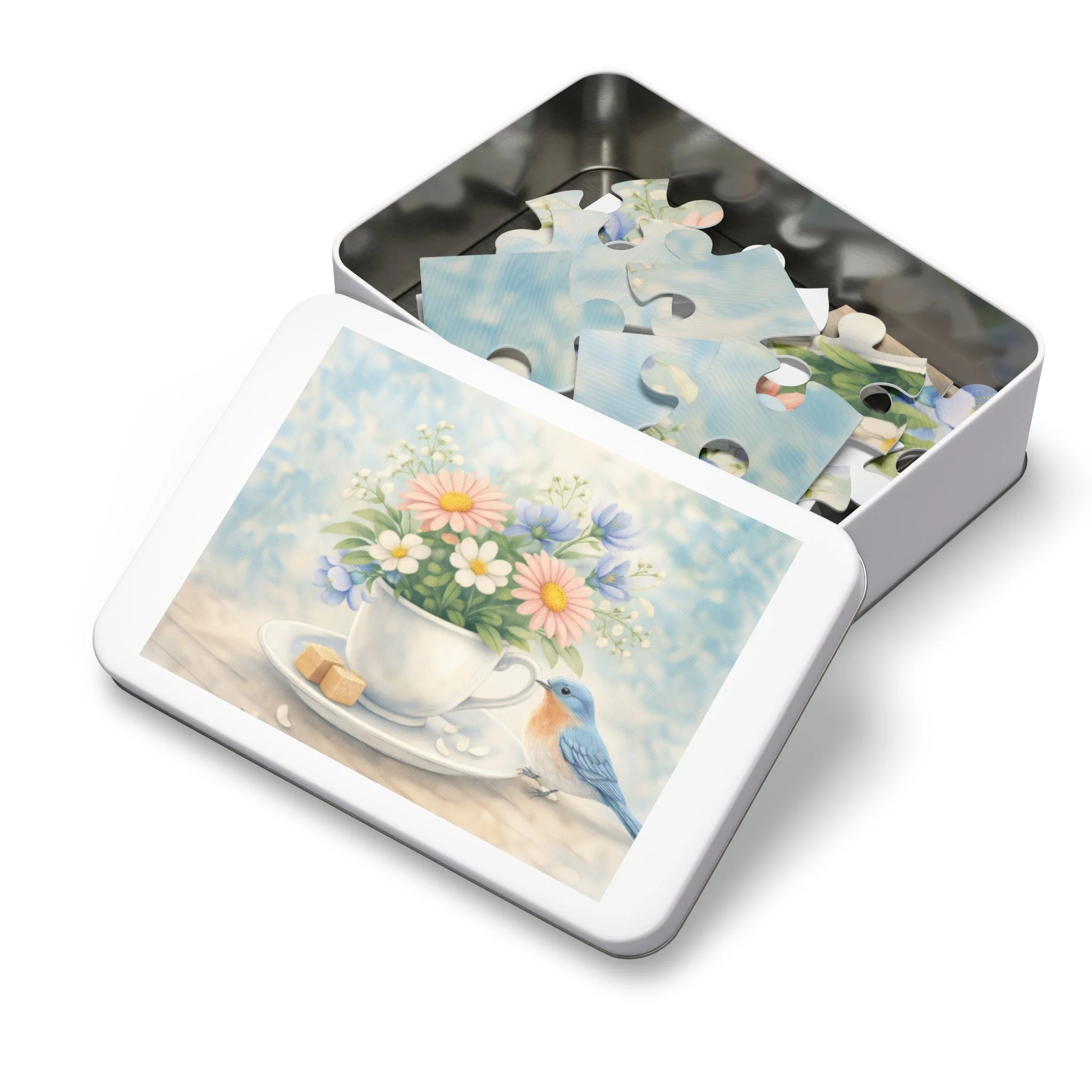 Tea Cup Floral Jigsaw Puzzle with Bluebird Tin Vintage Garden Puzzle
