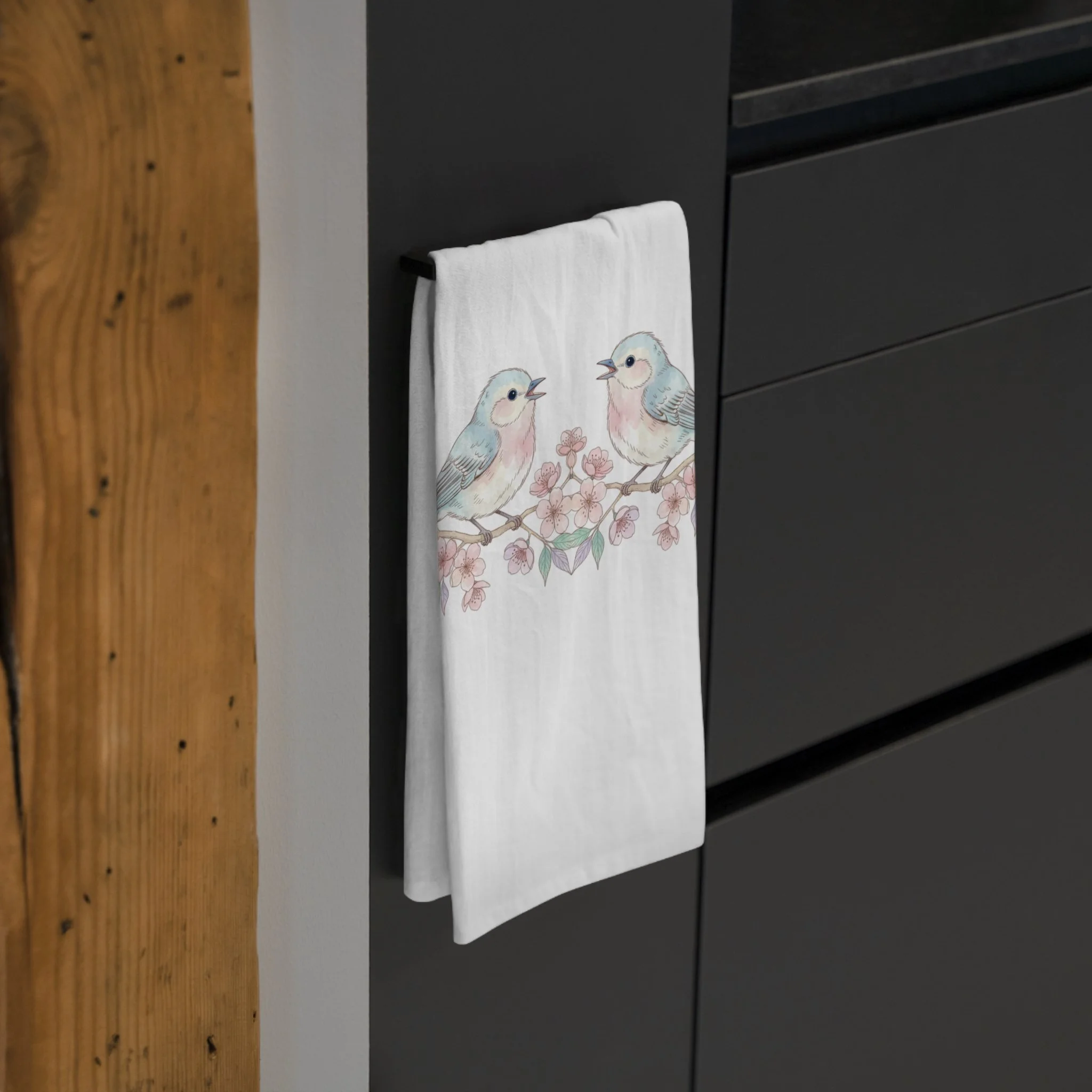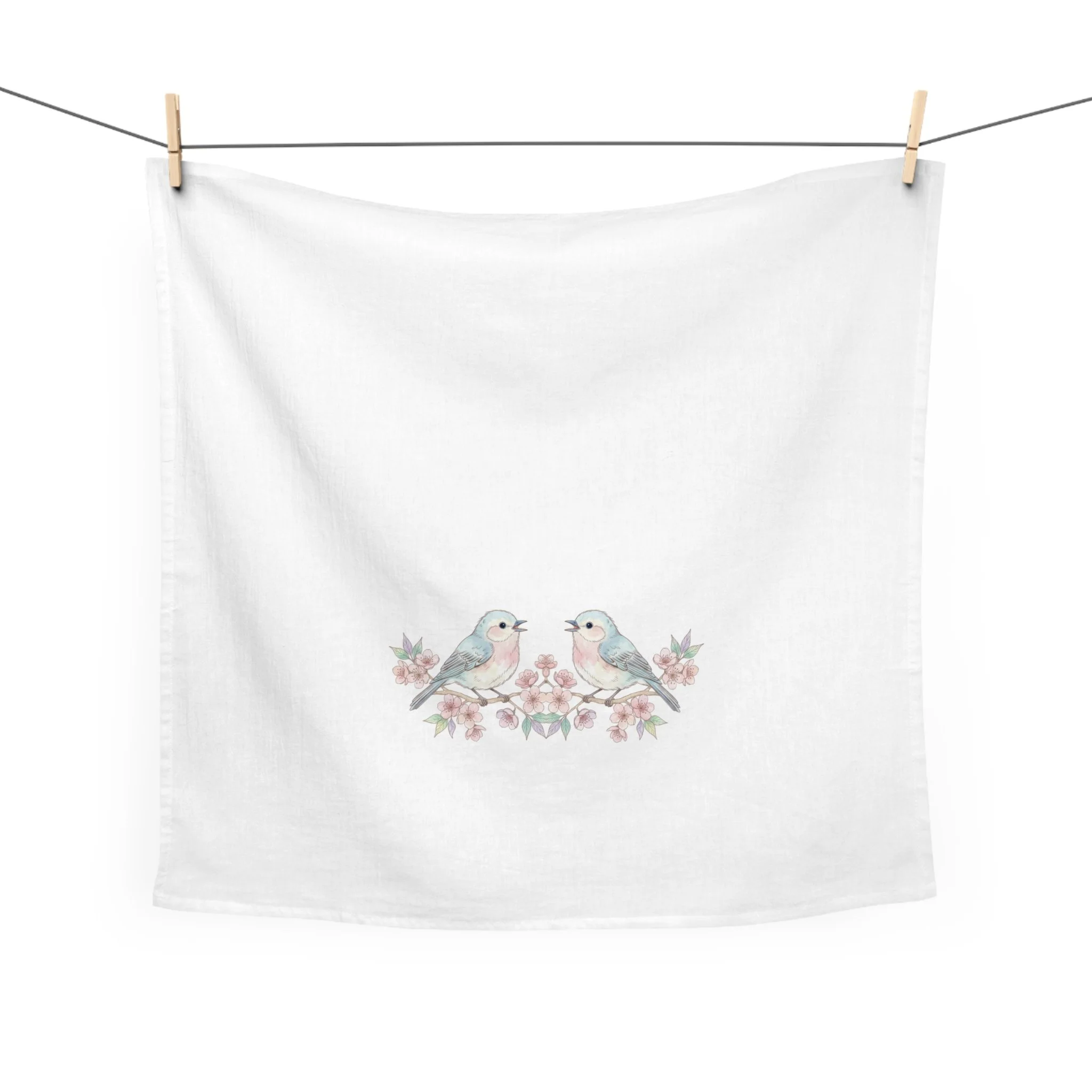 A soft, 100% cotton tea towel printed with a delicate watercolor bird perched among blush cherry blossoms. The muted pastels and hand-painted feel bring a quiet, cottagecore charm to everyday chores. Lightweight and absorbent, it drapes easily over an oven handle, lines a bread basket, or adds a gentle focal point when folded on open shelving. The hemmed edges and sewn-in care label keep it tidy through regular use and washes. This towel feels like a small daily ritual—sunlit mornings, warm mugs, and the hush after rain—made tangible in cloth.