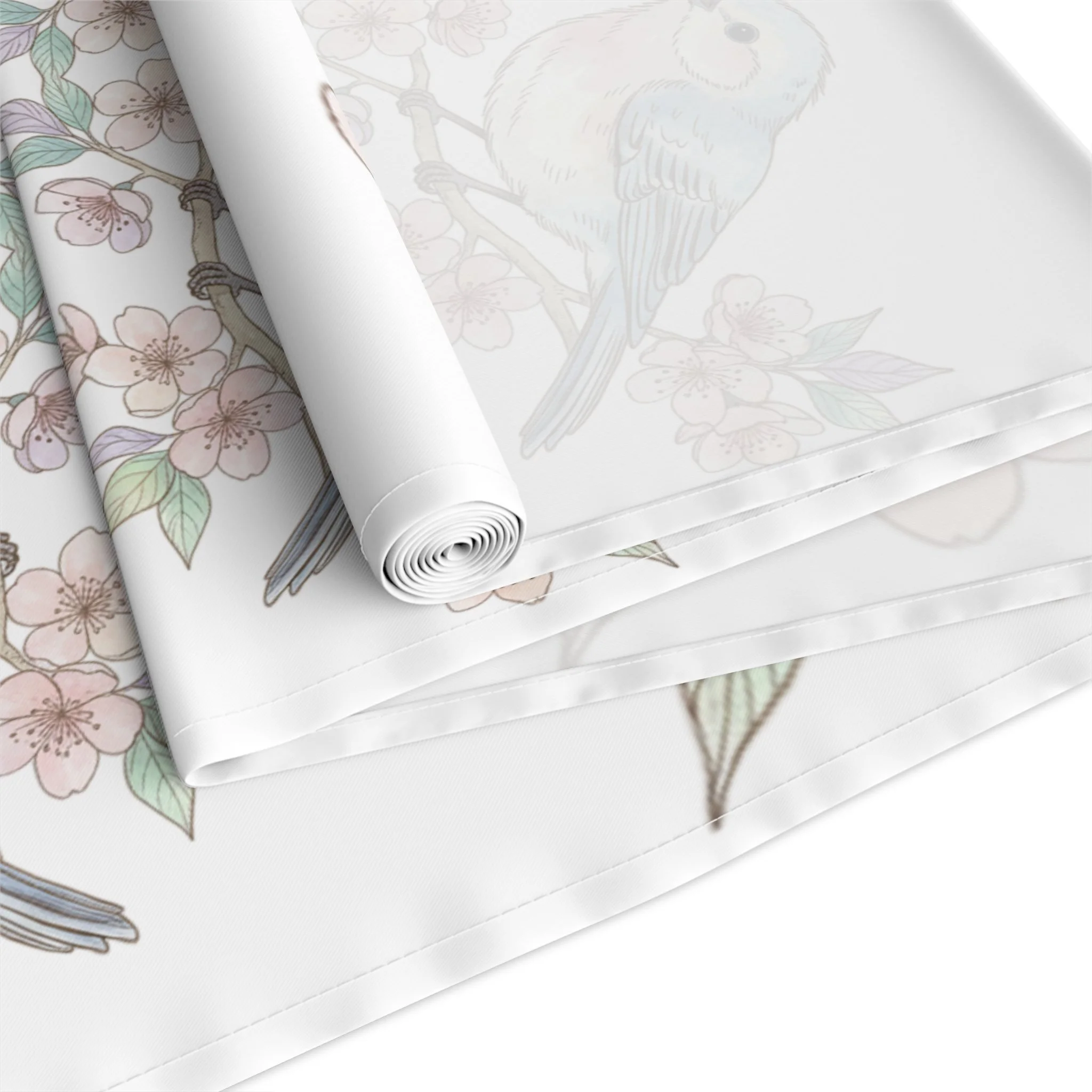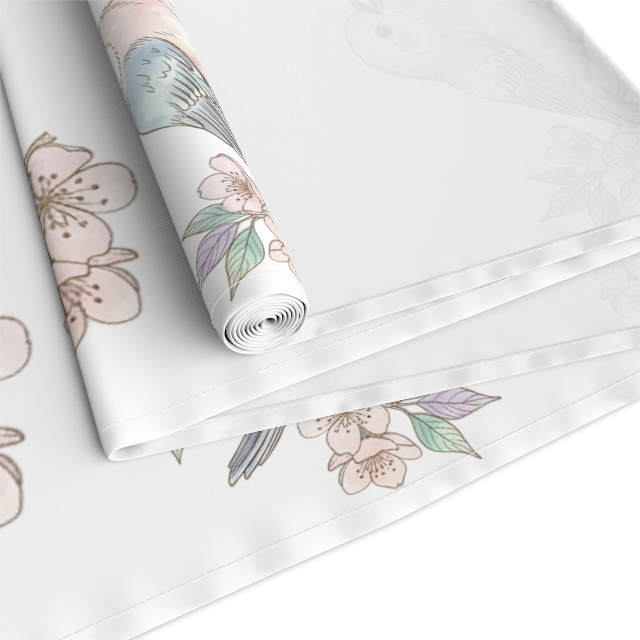 A light, airy table runner printed with a delicate pattern of soft watercolor birds perched among blush florals. The design reads gentle and refined on a clean white background, bringing a quiet, botanical charm to dining and seasonal settings. It slips easily into slow, sunlit brunches or intimate dinners — layering texture without shouting. Choose the quick-drying polyester for vivid, crisp color and easy care, or the cotton twill for a softer, more muted finish and a classic textile feel. Hemmed edges keep the piece tidy through repeated use, while the long proportions let it cascade over a variety of table depths for layered styling.