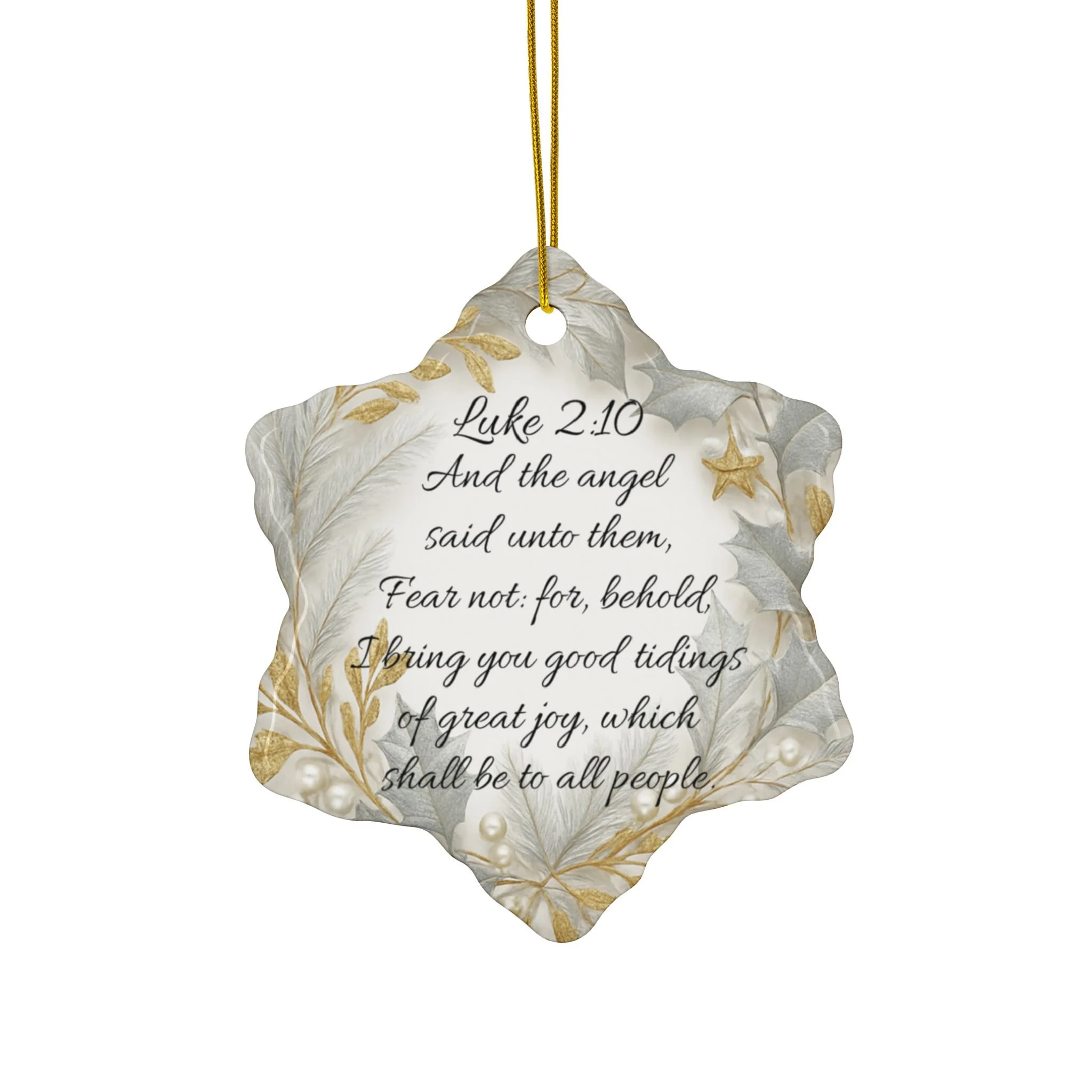 Each ornament is made from durable 100% ceramic and showcases an elegant, two-sided print of the verse. Available in your choice of snowflake or circle design, each piece has a glossy finish and comes with a gold string for easy hanging.
