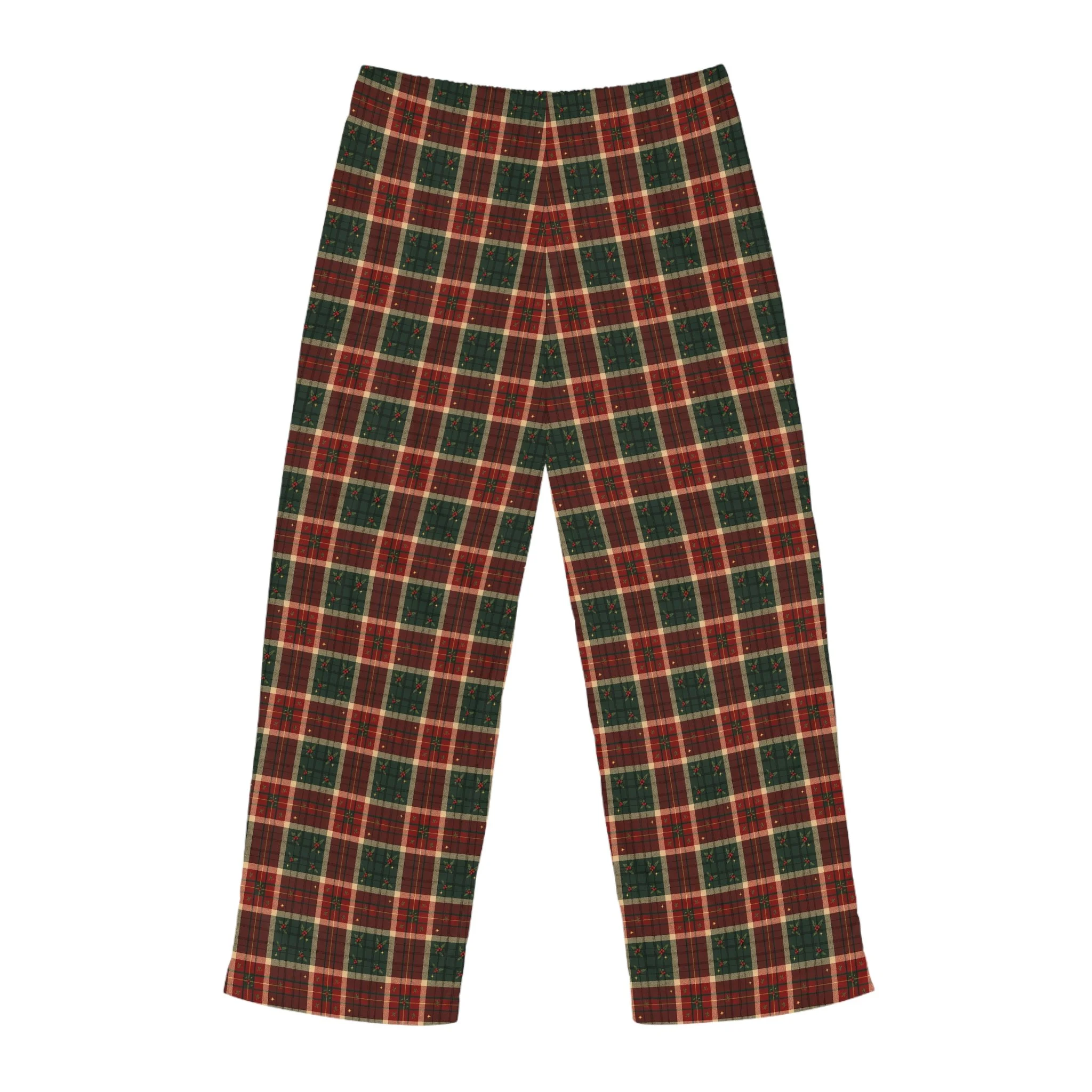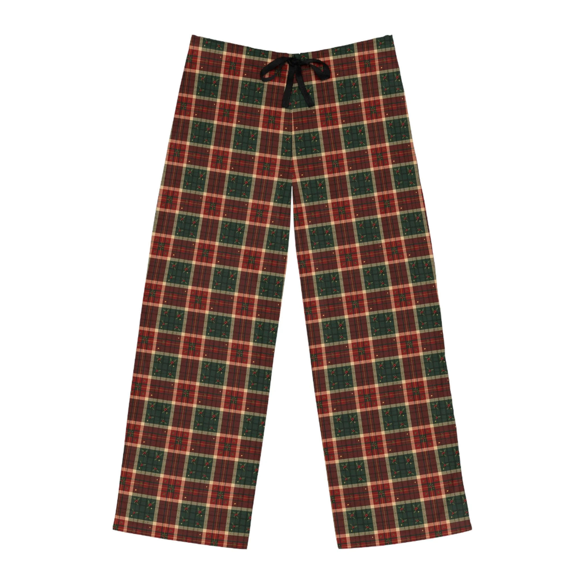 Designed for comfort and convenience, each pair includes a back elastic waistband with an adjustable black drawstring for the perfect fit. The vivid all-over plaid print brings cheerful holiday charm to every moment, while the soft drape and smooth texture make them a joy to wear.