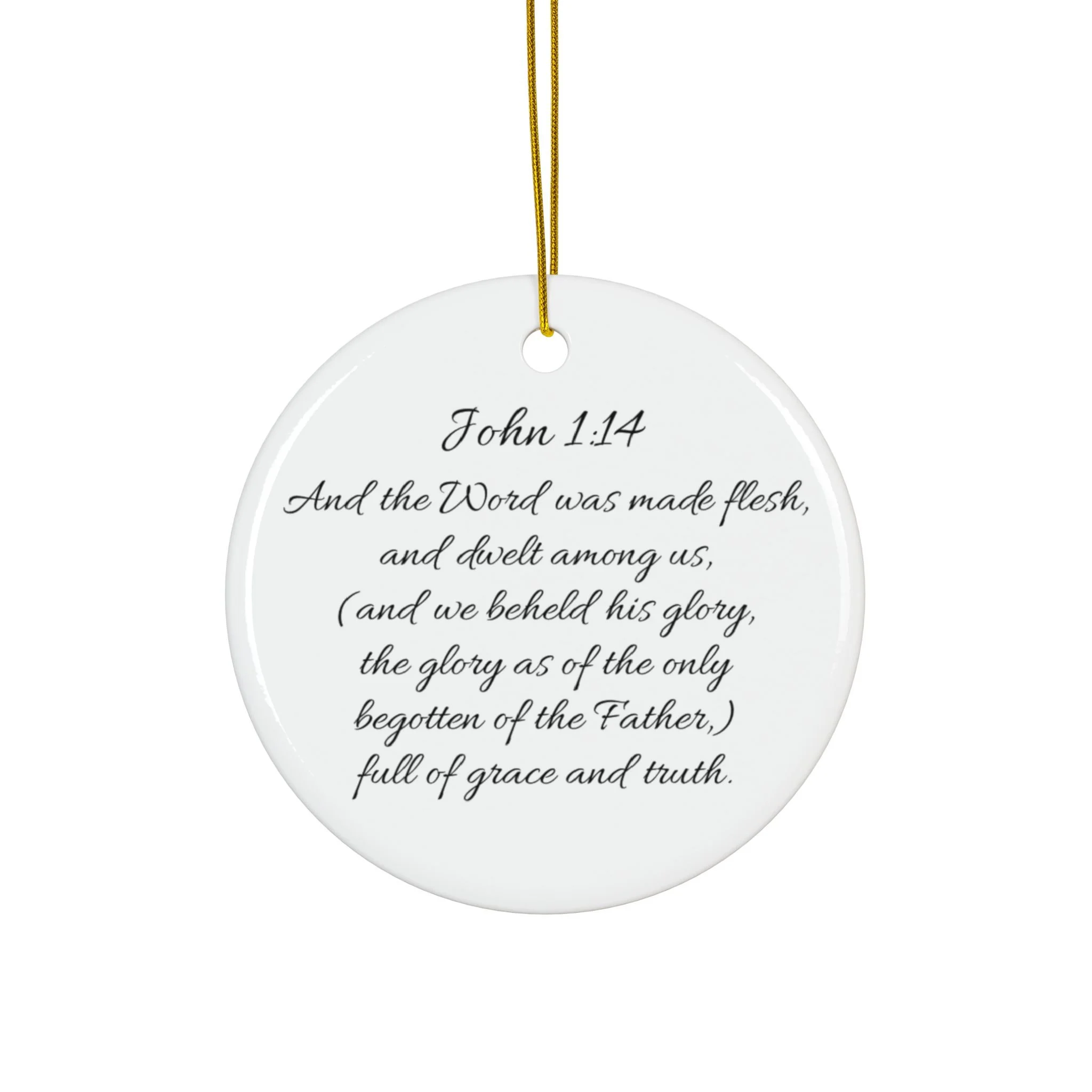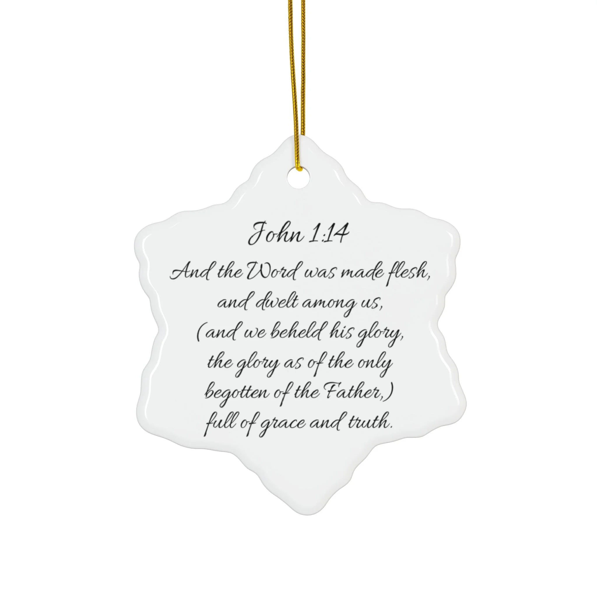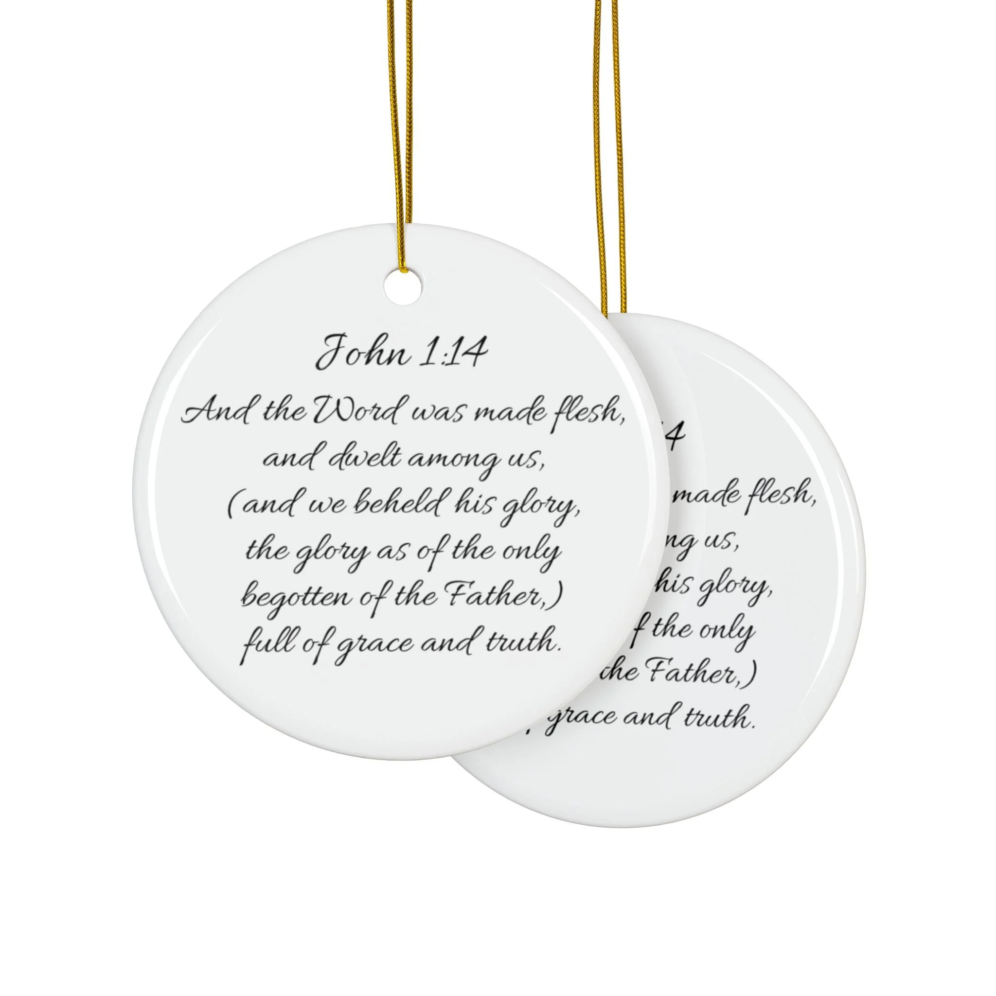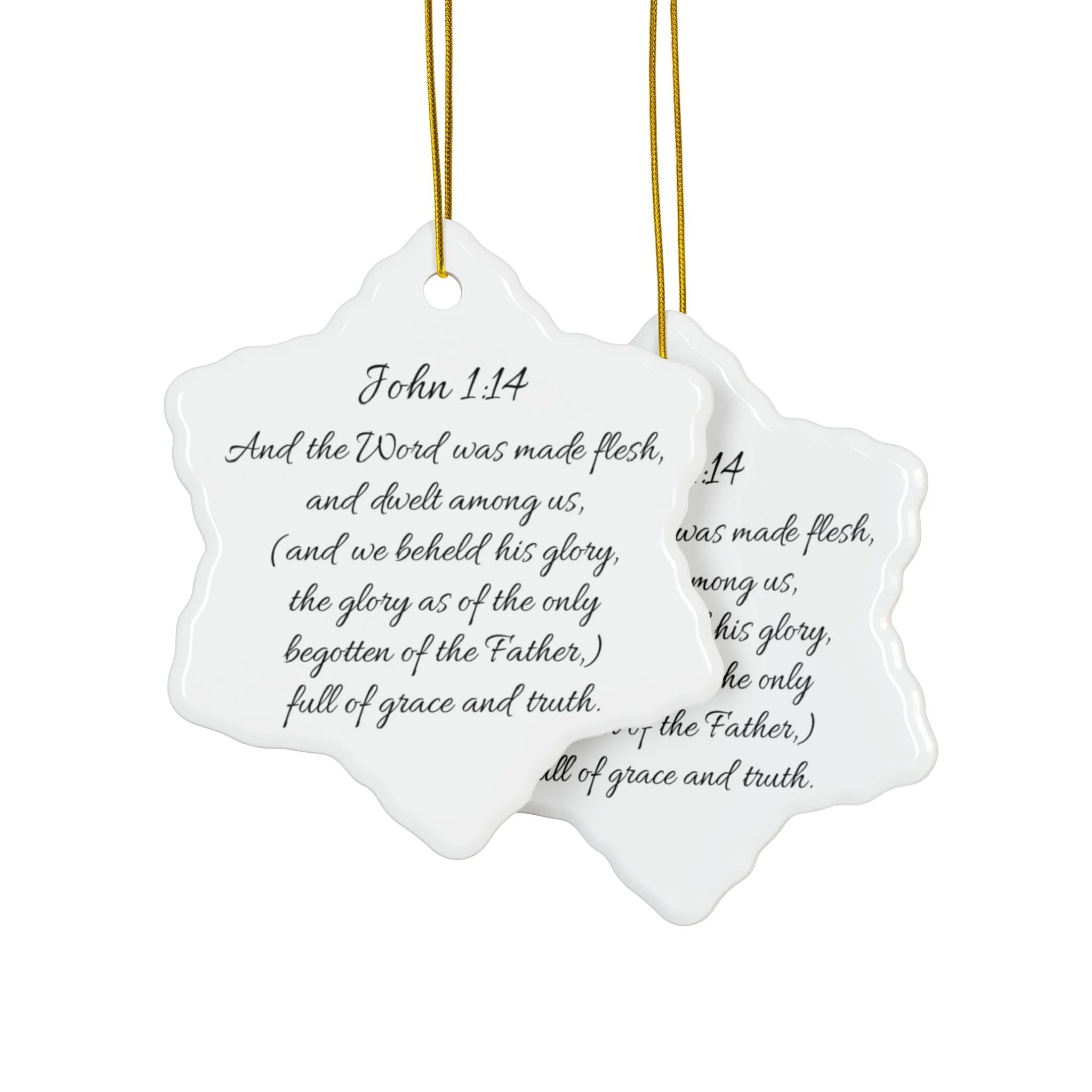 Each ornament is made from durable 100% ceramic and showcases an elegant, two-sided print of the verse. Available in your choice of snowflake or circle design, each piece has a glossy finish and comes with a gold string for easy hanging.
