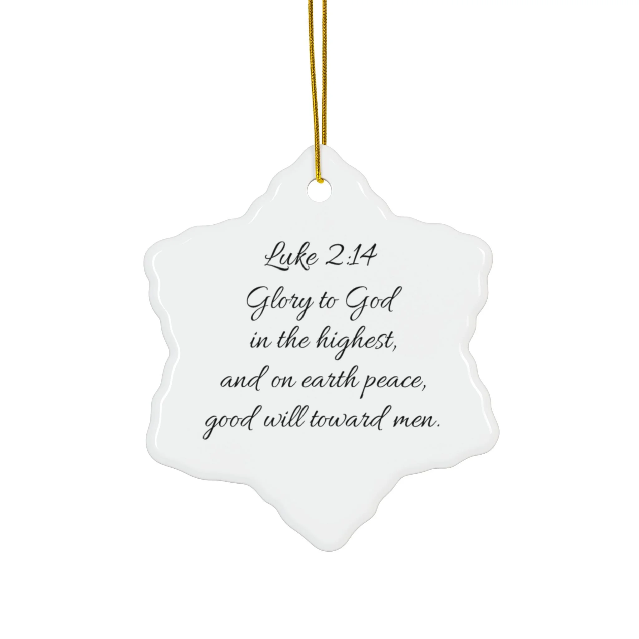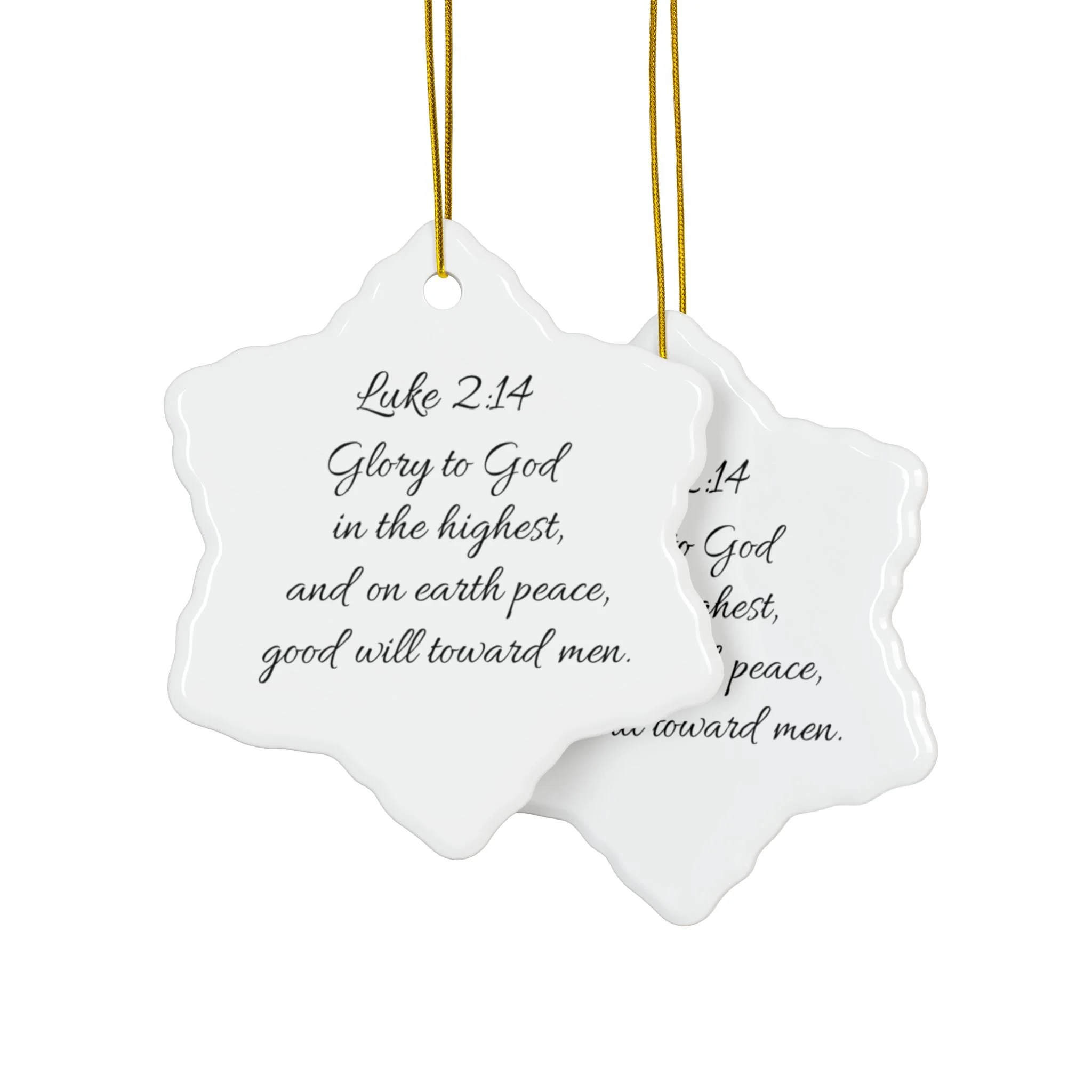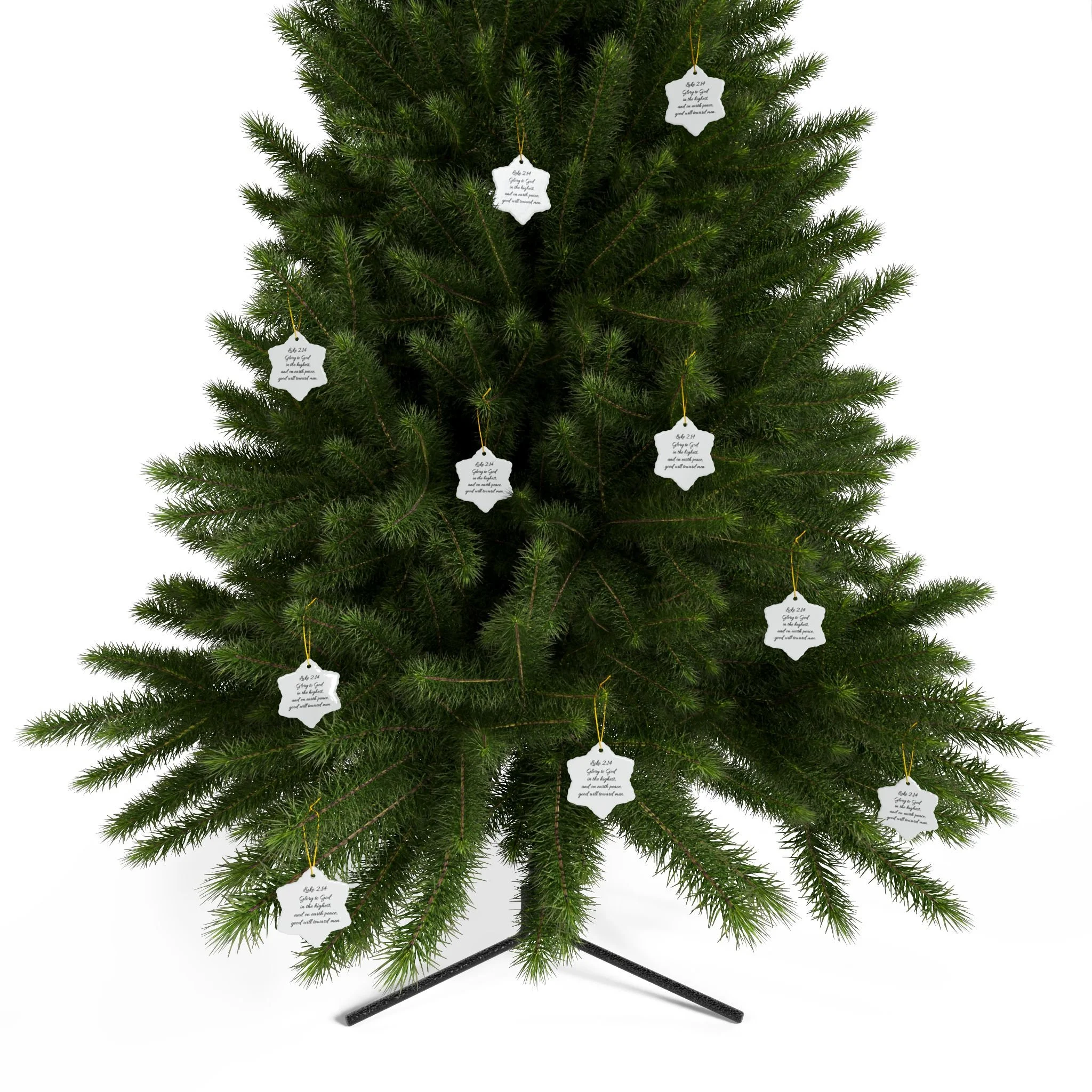 Each ornament is made from durable 100% ceramic and showcases an elegant, two-sided print of the verse. Available in your choice of snowflake or circle design, each piece has a glossy finish and comes with a gold string for easy hanging.