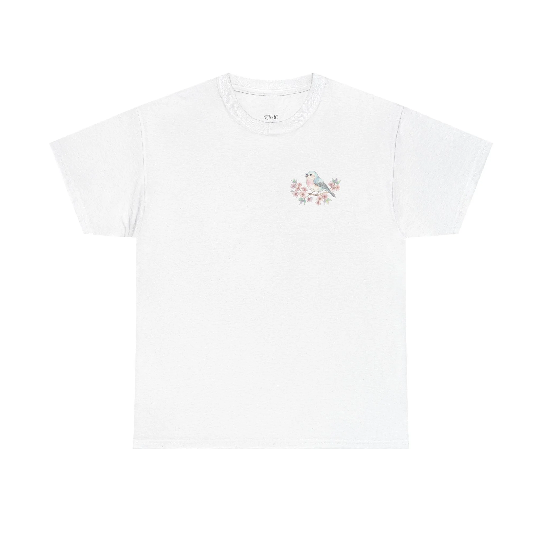 Light, quiet, and full of small joy — this soft cotton tee carries a delicate chest print that reads like a private note. The classic crew cut and relaxed fit make it an everyday layer you reach for when you want comfort without shouting. Wear it on slow mornings with coffee, on walks through the neighborhood, or layered under a jacket for an easy, thoughtful look. The gentle print sits close to the heart and pairs naturally with jeans, skirts, or lounge pants — a subtle way to show a softer side.